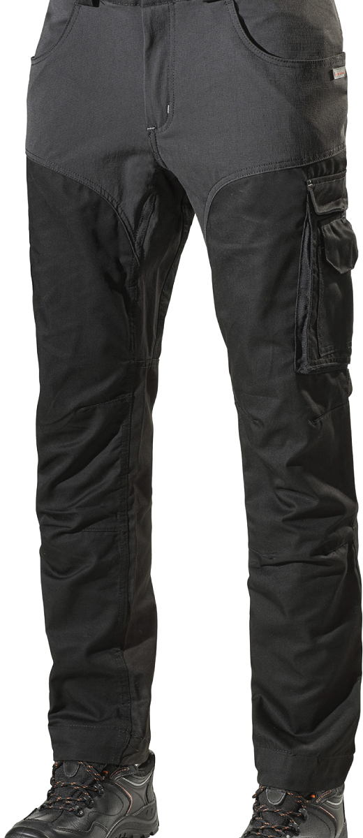 Två framfickor. Infällda stolpfickor bak. Höger benficka med tumstocksficka och pennfickor. Benficka med utvändig vinklad telefonficka försedd med magnetlås.