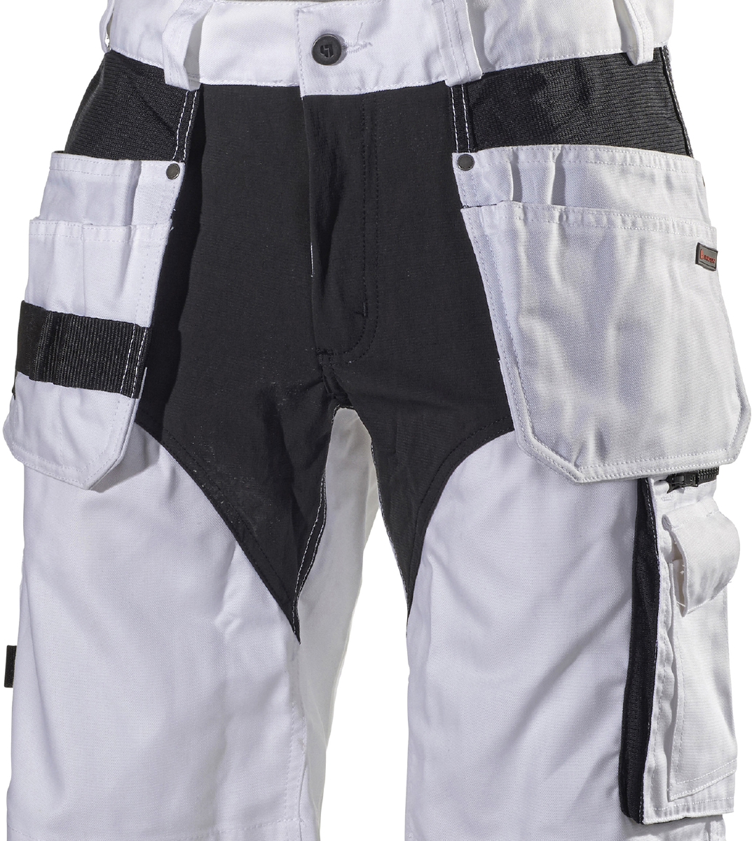 Två hängfickor, fyra framfickor och två bakfickor. Tumstocksficka, benficka med dragkedja och utvändig telefonficka samt ID-korthållare på höger hängficka.