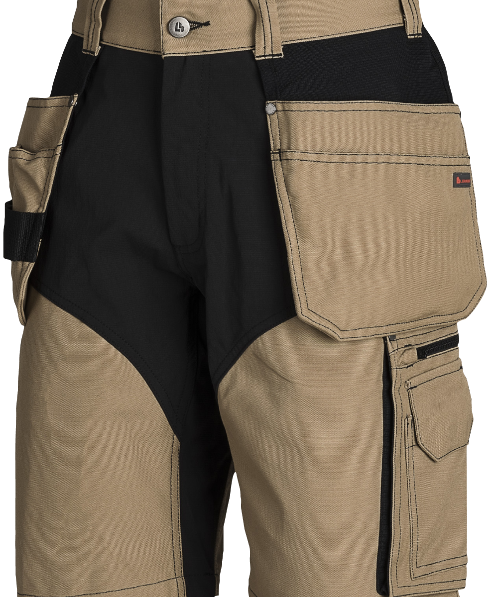 Två hängfickor med ID-korthållare på höger sida och två framfickor. Infällda stolpfickor bak. Tumstocksficka. Benficka med dragkedja och utvändig vinklad telefonficka försedd med magnetlås.